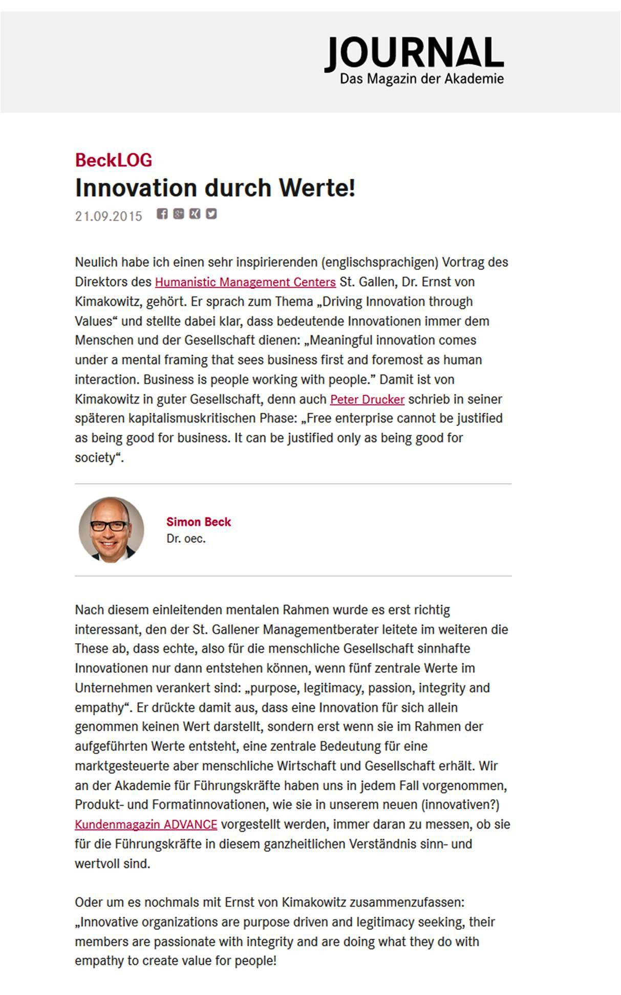 In their magazine Journal Dr. Simon Beck, Managing Director of Die Akademie, wrote a well rounded and concise summary of the presentation given at the Rotary International event in Stuttgart we participated in earlier this year where we presented on Driving Innovation through Values.